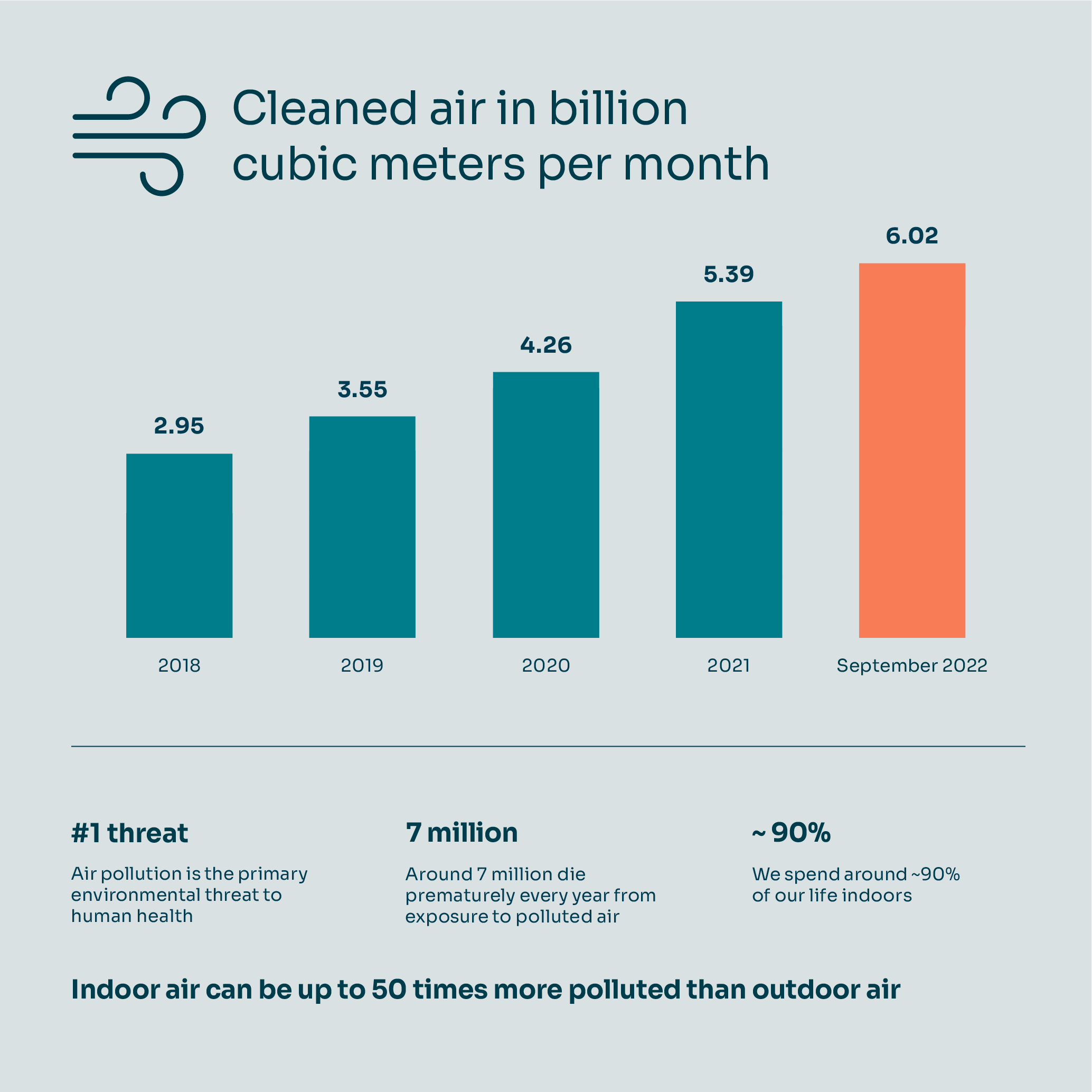 Air pollution is now considered the world's biggest environmental threat to health and accounts for 7 million premature deaths around the world each year, according to the WHO. Air pollutants accumulate indoors where the air can be up to 50 times more polluted than outdoor air, which is problematic because we spend about 90% of our time indoors.