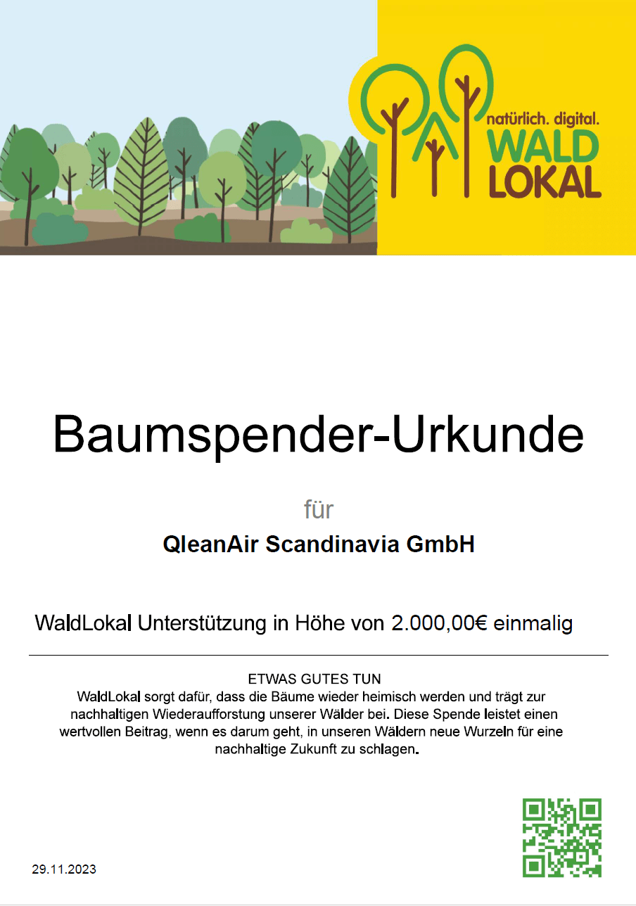 Das Weihnachtsfest ist nicht nur eine Zeit für Familie und Traditionen, sondern bietet ebenfalls an vielen Stellen Gelegenheit, ressourcenschonend zu handeln. Wie Sie sicher wissen, steht bei QleanAir Scandinavia der Schutz der Natur im Mittelpunkt unserer Tätigkeit. Ökologische Verantwortung ist ein wesentlicher Bestandteil unserer Unternehmensphilosophie und der Umweltaspekt spielt in all unseren Tätigkeiten eine selbstverständliche und integrale Rolle. Daher werden wir auch in diesem Jahr im Sinne der Nachhaltigkeit auf den Versand von Weihnachtskarten verzichten und haben stattdessen an die Organisation „Waldlokal“ gespendet.