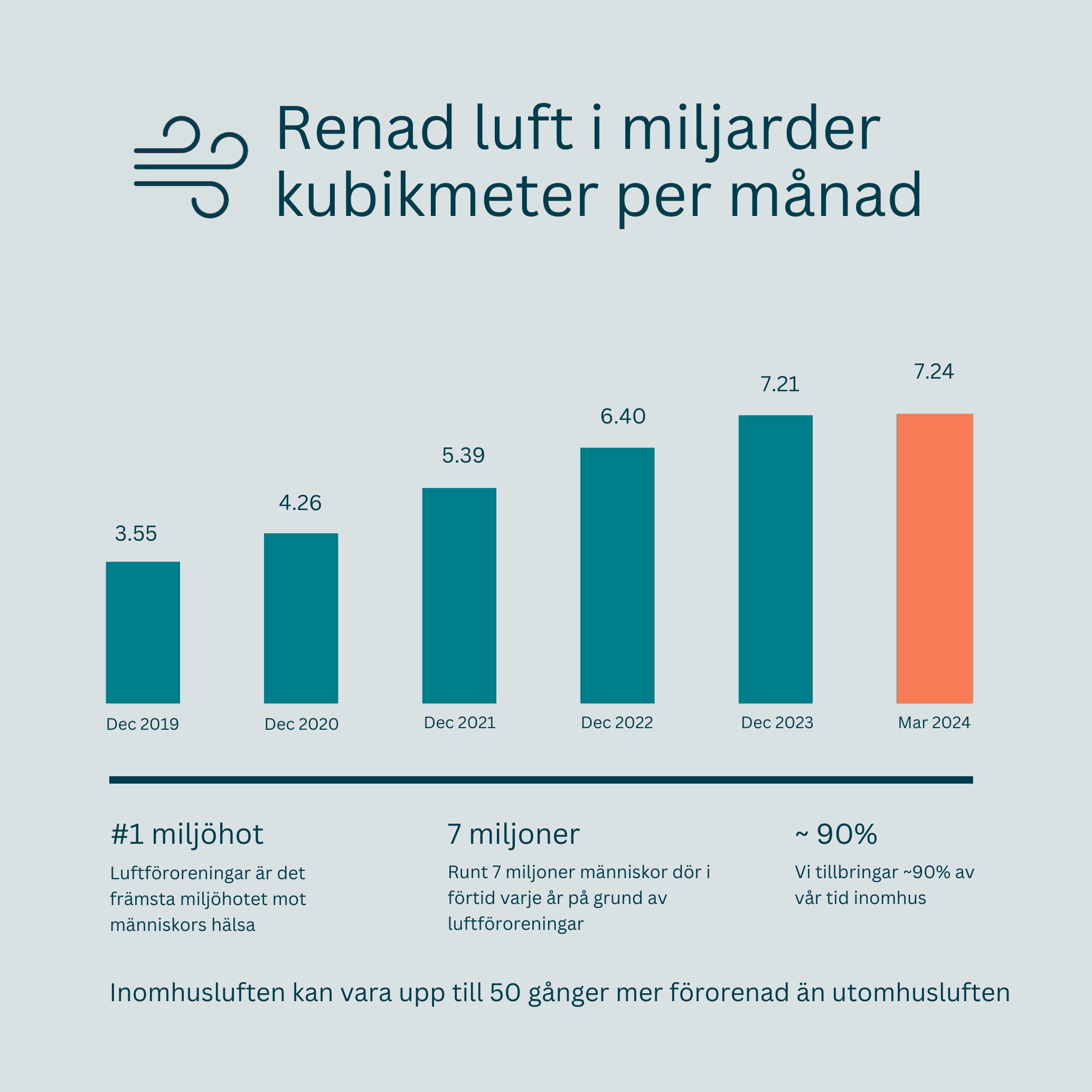 Luftföroreningar anses nu vara världens största miljöhot för hälsan och står för 7 miljoner förtida dödsfall runt om i världen varje år enligt WHO. Luftföroreningar ackumuleras inomhus där luften kan vara upp till 50 gånger mer förorenad än utomhusluft, vilket är problematiskt eftersom vi tillbringar ungefär 90 % av vår tid inomhus.