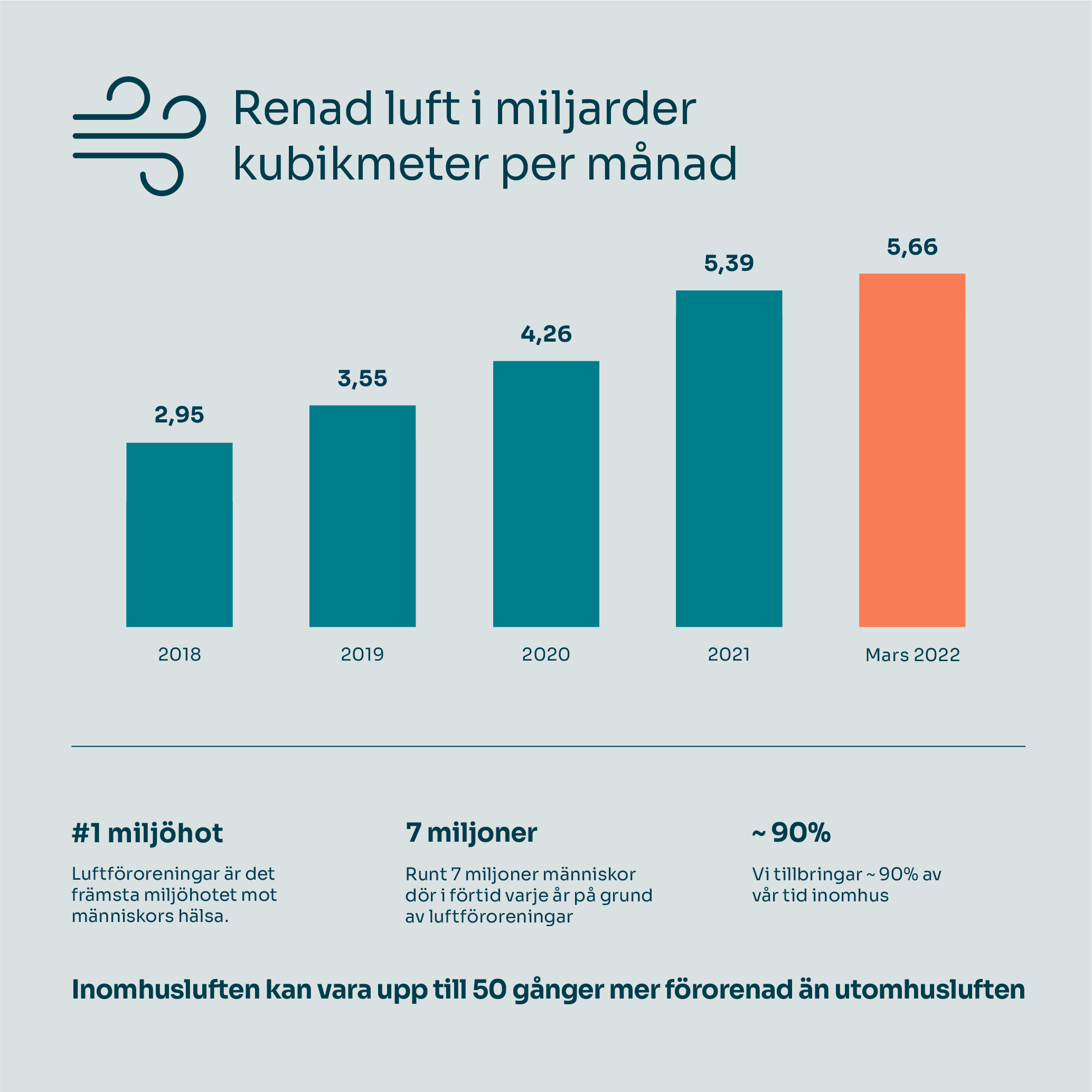QleanAir levererade i slutet på mars 5,66 (4,45) miljarder kubikmeter renad inomhusluft per månad. Det motsvarar en ökning på 27,2% jämfört med första kvartalet för föregående år. QleanAir mäter volymen av renad inomhusluft genom sina luftrenare, renrum och Cabin Solutions kvartalsvis på global basis.