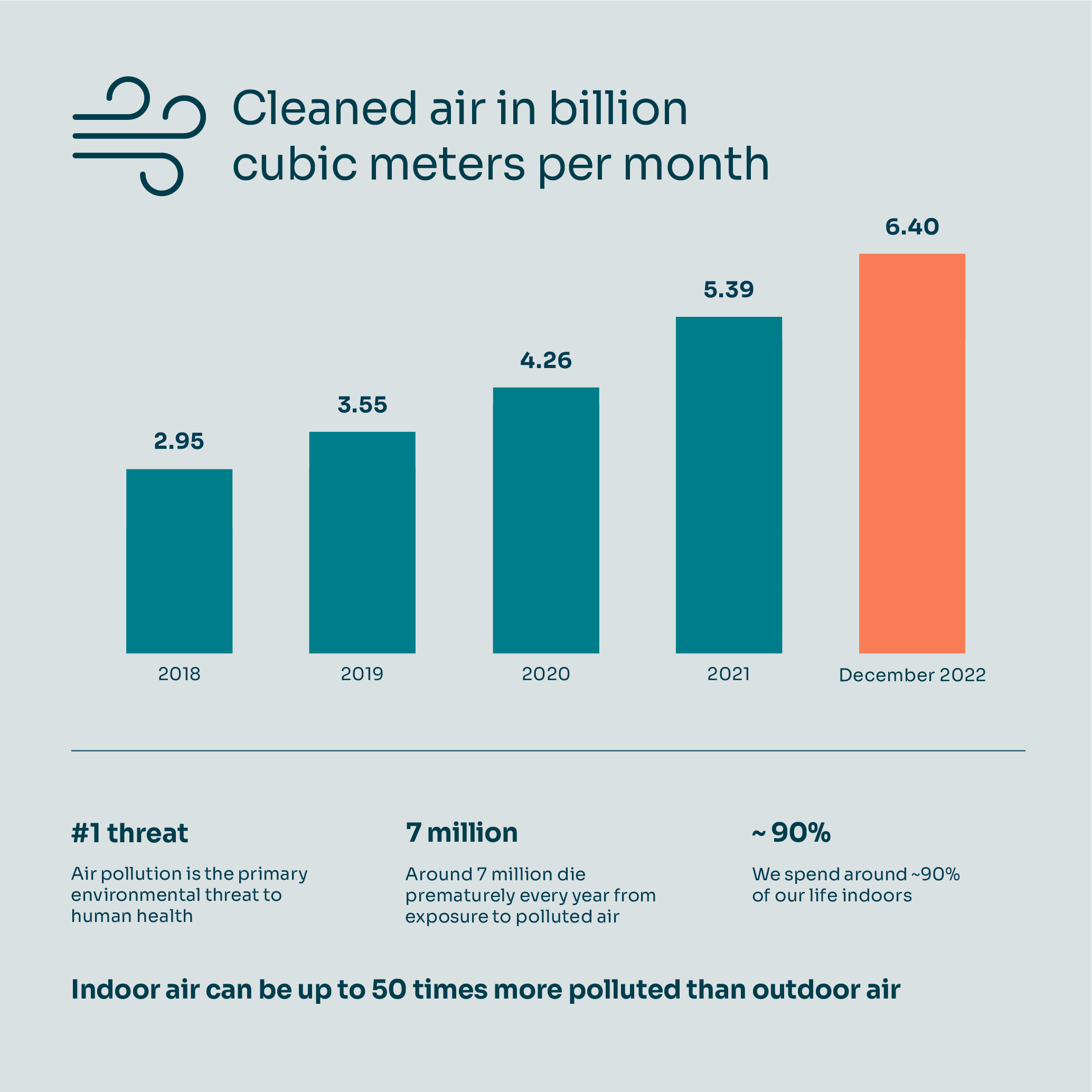 Air pollution is now considered the world's biggest environmental threat to health and accounts for 7 million premature deaths around the world each year, according to the WHO. Air pollutants accumulate indoors where the air can be up to 50 times more polluted than outdoor air, which is problematic because we spend about 90% of our time indoors.