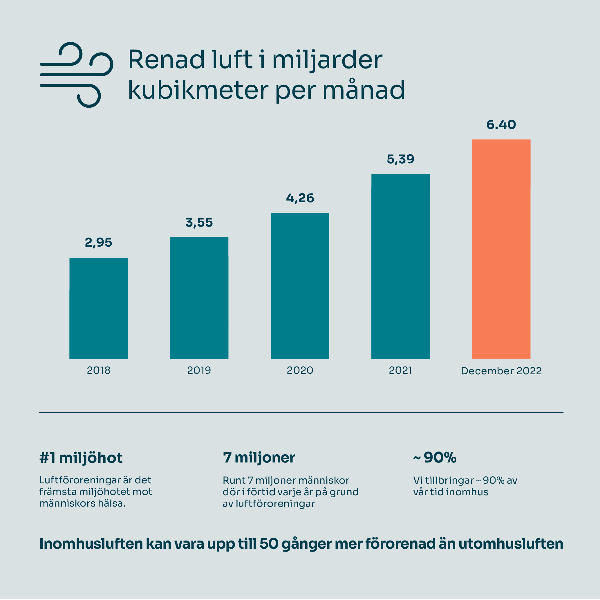 Luftföroreningar anses nu vara världens största miljöhot för hälsan och står för 7 miljoner förtida dödsfall runt om i världen varje år enligt WHO. Luftföroreningar ackumuleras inomhus där luften kan vara upp till 50 gånger mer förorenad än utomhusluft, vilket är problematiskt eftersom vi tillbringar ungefär 90 % av vår tid inomhus.