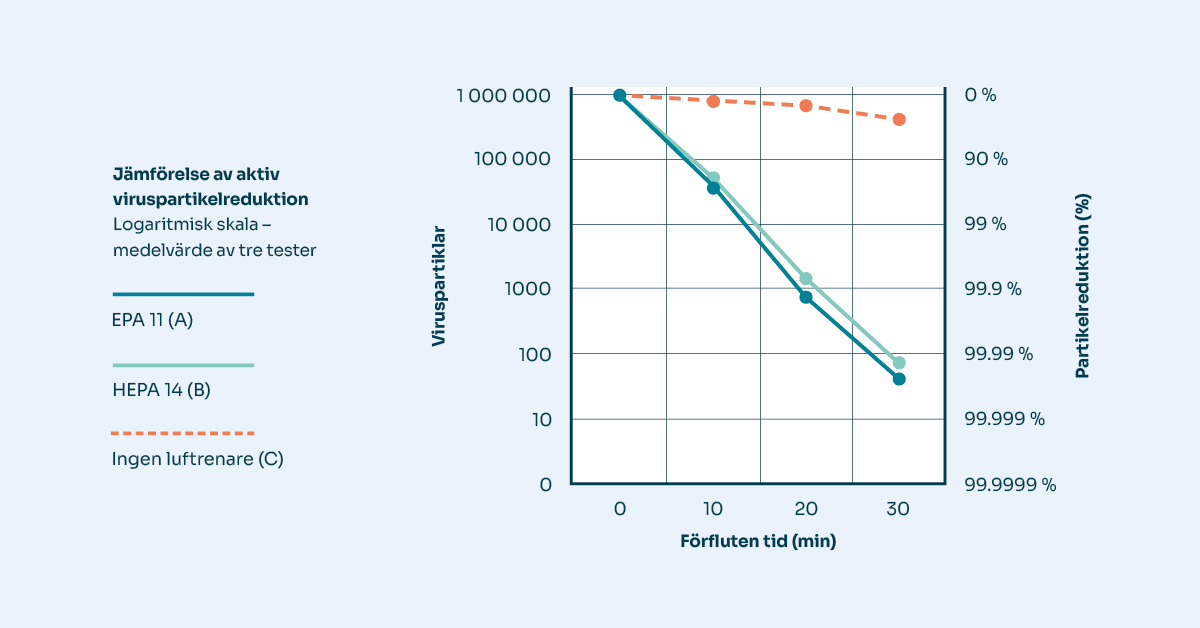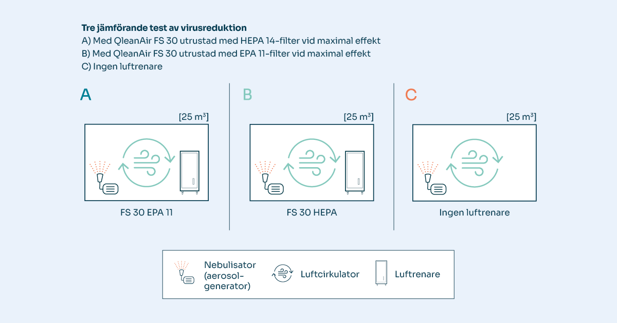 Studien genomfördes i en säker testkammare. Aktivt virus spreds med en aerosolgenerator och fångades in med hjälp av den mobila luftrenaren QleanAir FS 30 utrustad med två olika huvudfilter, HEPA 14 och EPA 11. Det tog bara 10 minuter att ta bort över 95 % av viruspartiklarna från luften med luftrenaren. Utan luftrenare var partikelreduktionen endast 16,9 %. Efter 20 minuter eliminerades cirka 99,9 % och efter 30 minuter över 99,99 %. FS 30 utrustad med EPA 11-filtret nådde 99,9 % och 99,99 % partikelreduktion något snabbare på grund av dess högre luftflöde.
